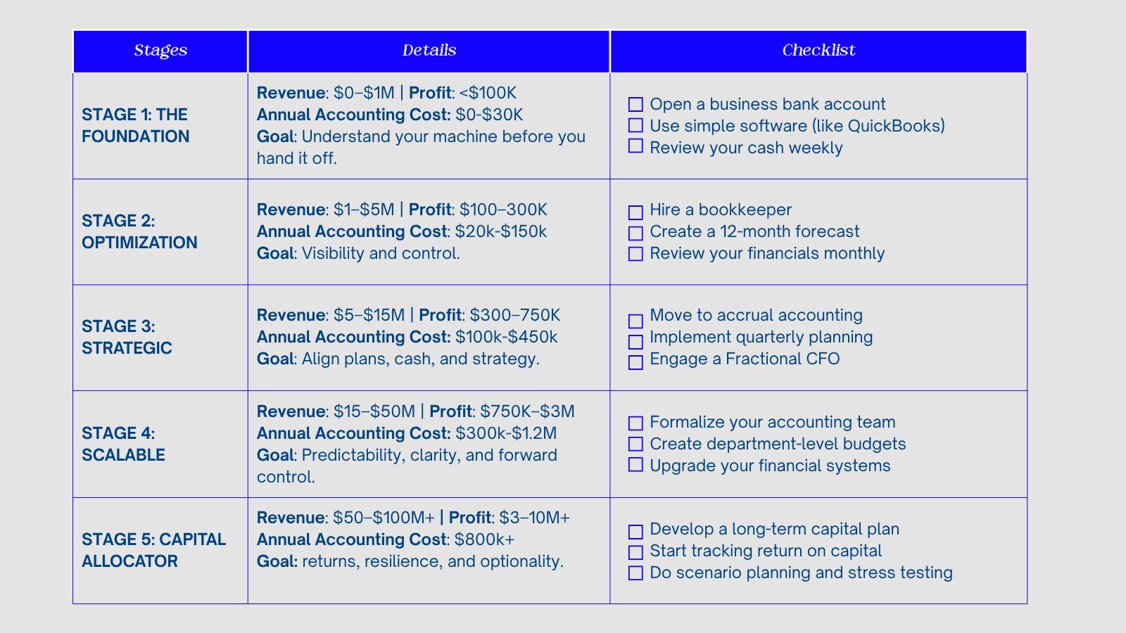 They’re all variations of the same question: what’s next for my finance function? And it’s a good question. Because too many business owners either build too soon and add layers of complexity before they’ve nailed the basics or wait too long, letting chaos and uncertainty force their next move. The truth is, your financial system evolves in phases, just like your operations or your team. Each stage demands a new way to think, plan, and measure. You don’t need everything at once. You just need to know where you are and what comes next. Today, I’m going to break down the 5 stages of business finance and what it means for you. STAGE 1: THE FOUNDATIONRevenue: $0–$1M In the early days, your job isn’t to hire a bookkeeper. It’s to get the business off it’s feet. To do that, you need to understand the business model: What actually drives revenue? Where does margin come from? What costs scale and what don’t? This is an exercise in experimentation. Some find “the answer” early, others take tons of iterations. It doesn’t mean one was right and other wrong. One may have better instincts or just gotten lucky. At this phase, relying on a CPA or CFO to tell you what you need is a waste of time and stealing calories from what truly makes you successful. But, you know what will steal those calories? Not knowing what’s working or not. The only way to address this is separating your books from your personal finances. This separation creates clarity, which allows you to actually focus on the business model as you need to. So: