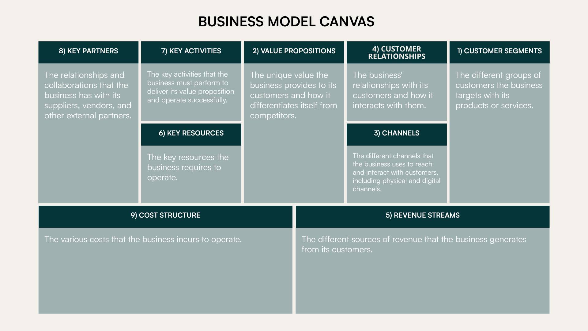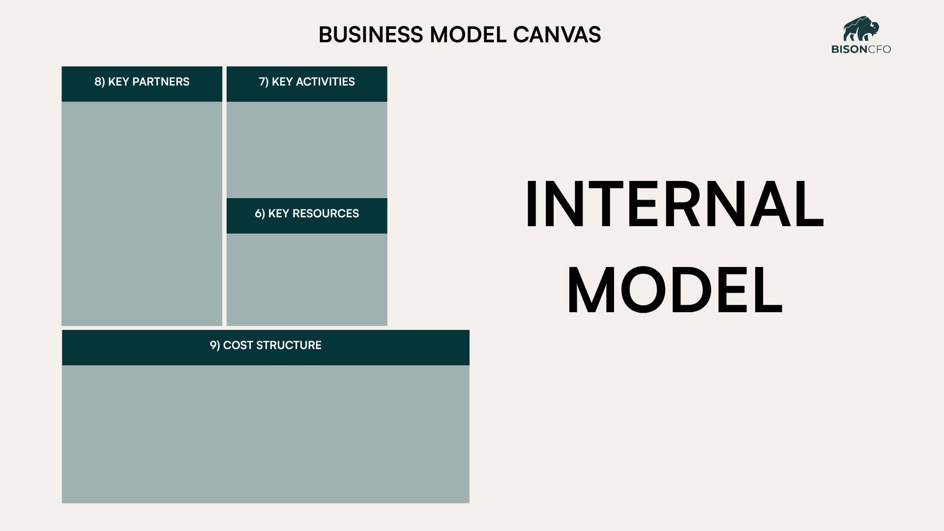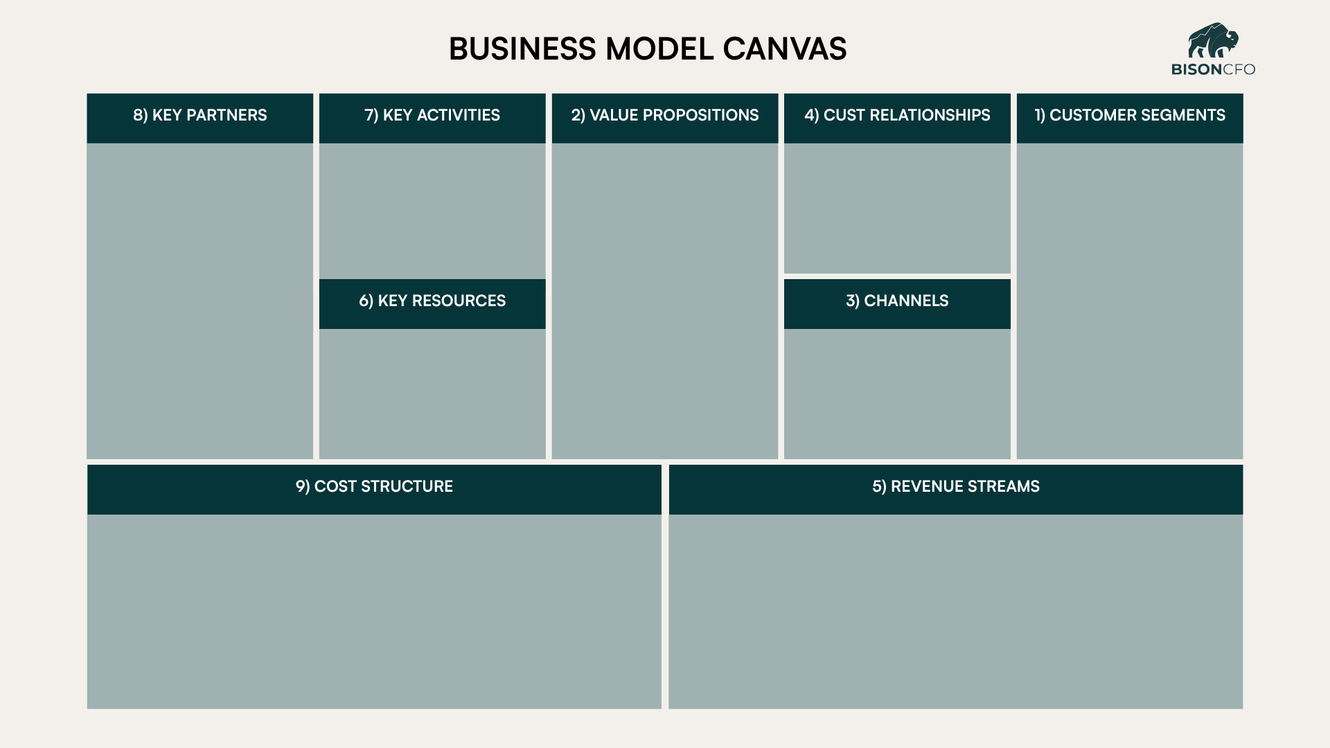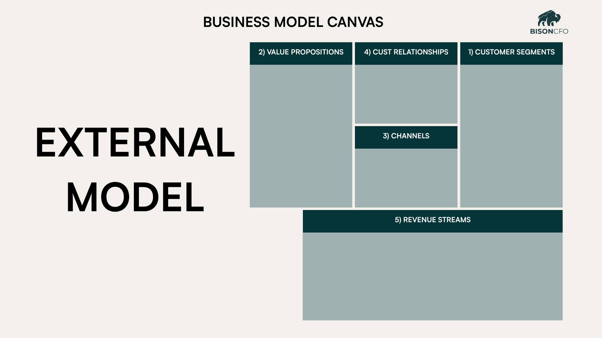 THE ONE-PAGE TOOL EVERY SMB SHOULD BE USING (BUT ALMOST NONE DO)Most people think a CFO shows up with spreadsheets, ratios, and financial models. But when a new client hires us at Bison CFO, the first thing we pull out isn’t a spreadsheet… it’s a single sheet of paper: The Business Model Canvas. At first, this throws people off. “Aren’t you supposed to be doing the numbers? Why are we talking about customers and value props?” Because here’s the truth: Your financials are just the downstream effect of how your business actually works. If we don’t understand the business, we can’t advise it. And for most small and mid-sized businesses, almost no one has ever mapped out how the business really functions. The Business Model Canvas gives you a shared language, exposes assumptions, and ultimately creates clarity about what the business does and how they do it. We use it with every client because it accelerates understanding for us, but we also consistently see something “clicks” for the leadership teams we do this with. Below, we’ll walk through all nine sections of the canvas, using a physical security business as our example. EXTERNAL MODELThe first thing we always tackle are the external elements of the business model. We call these the market-facing elements: